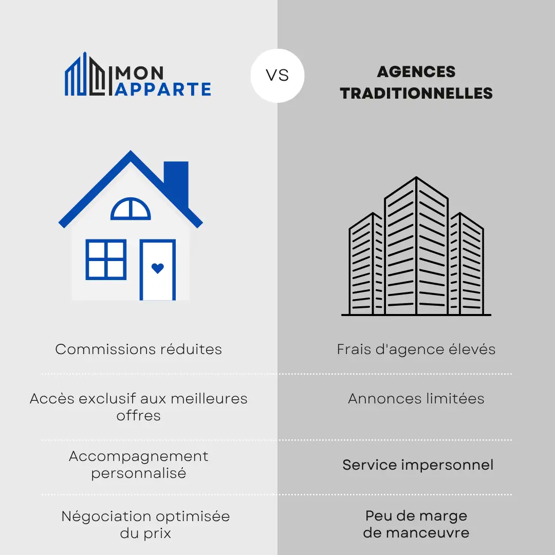 Les agences traditionnelles se caractérisent généralement par des frais élevés, qui impactent directement le budget de l’acheteur. Leur accès aux biens reste souvent limité aux annonces publiques ou à leur portefeuille interne, réduisant les opportunités réelles. L’accompagnement est souvent standardisé, avec un service parfois impersonnel et peu adapté aux besoins spécifiques de chaque client. De plus, la marge de négociation est généralement faible, car les intérêts sont partagés entre vendeur et agence.